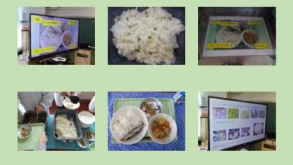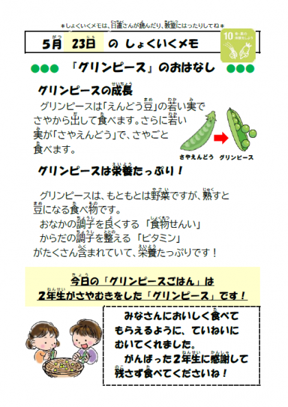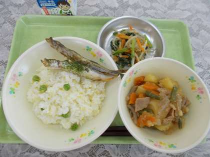 2年生がさやむきをしたグリーンピースを使った「グリーンピースごはん」をおいしくいただきました。