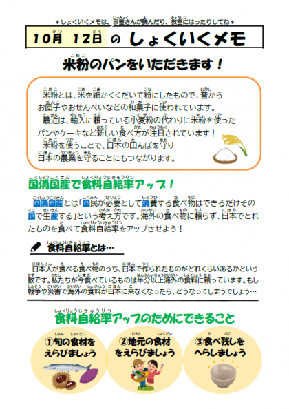「米粉パンなど国産食材を活用した食育」の取組で、米粉パンを美味しくいただきました。「米」について知り、国消国産(国民が必要として消費する食料はできるだけ国で生産する)や自給率などを学び、給食から地域のことや社会のことに目をむける機会になることを期待しています。