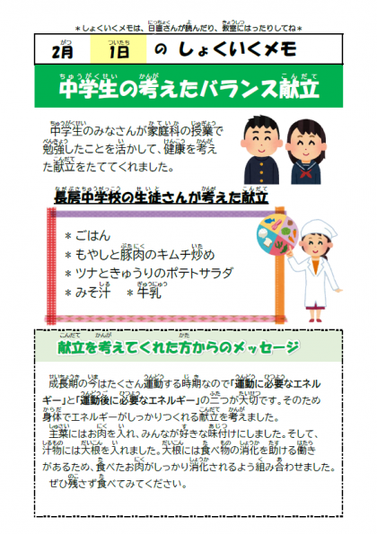 長房中学校の生徒さんが、家庭科の授業で勉強したことを活かし、健康を考えてたててくれた献立を美味しくいただきました。