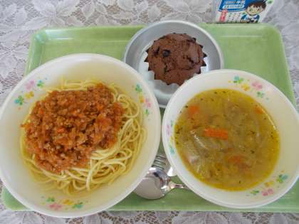 調理師さん手作りのチョコチップケーキを美味しくいただきました。外側がカリッとしていて、内側がふんわりした食感で大好評でした!