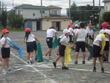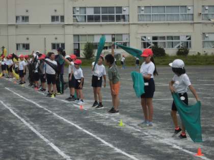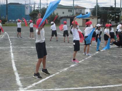 各学年、旗を持ったり、五輪をイメージした5色の布を持ったり