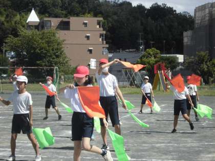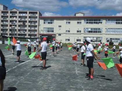 各学年、旗を持ったり、五輪をイメージした5色の布を持ったり