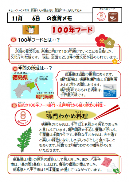 地域の食文化を未来に向けて100年続けていくことを目指した文化庁の取組である「100年フード」の、伝統の100年フード部門〜江戸時代から続く郷土の料理〜「鳴門わかめ料理」の献立でした。炒めた「わかめ」を初めて食べた人も多かったです。