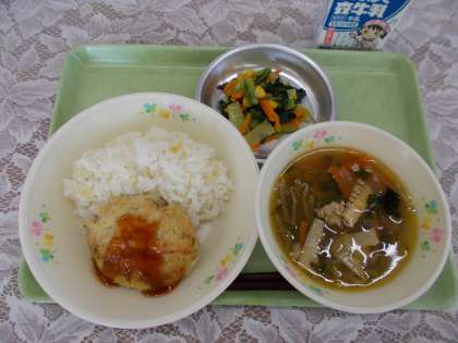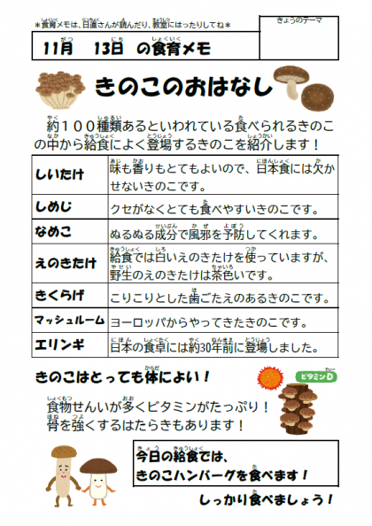 旬の食材「きのこ」をハンバーグで美味しくいただきました。ハンバーグの中のきのこは、エリンギとえのきでした。