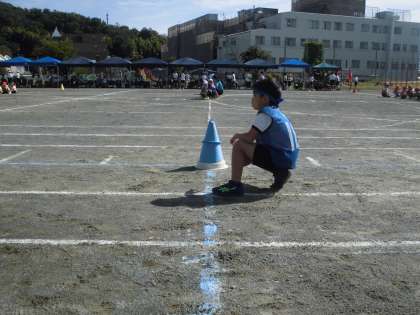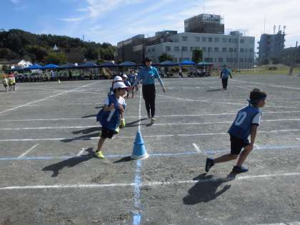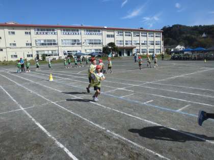 4チームに分かれて、リングバトンを使って、リレーをしました。