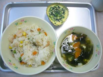 エビピラフに入っているグリンピースは、昨日2年生が食育の授業でさやむき