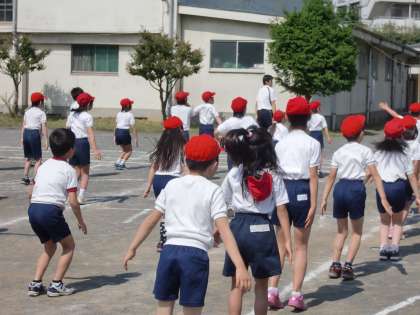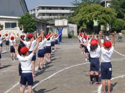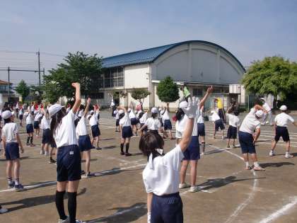 準備体操の練習です。指先までピンと伸ばして、美しい姿勢でできるでしょうか。