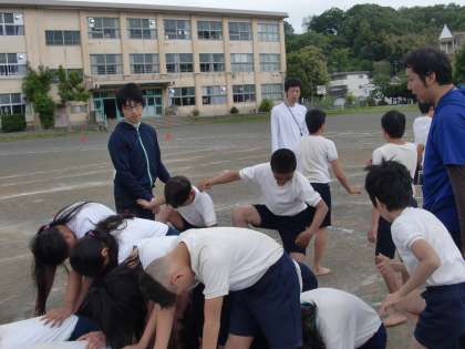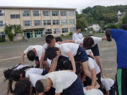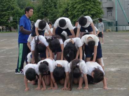 校庭で組体操の練習が本日も行われました。タワーを組み立てているようです。でも取材に気が付くと、そこまでに。これはまだトップシークレットのようです。