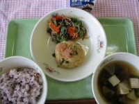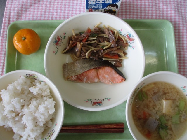 【本日の献立】麦ごはん 牛乳 焼き魚(鮭)変わりきんぴら田舎汁 くだもの   1...