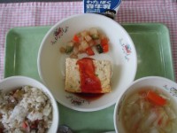 かつめしは、洋皿に盛ったごはんの上にビーフカツをのせ、デミグラス系のソースをかけて、ゆでキャベツを添えた加古川市のご当地グルメです。給食ではトンカツをのせていただきます。