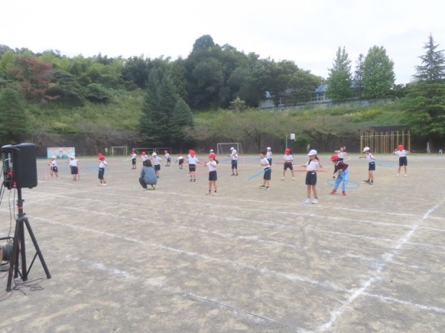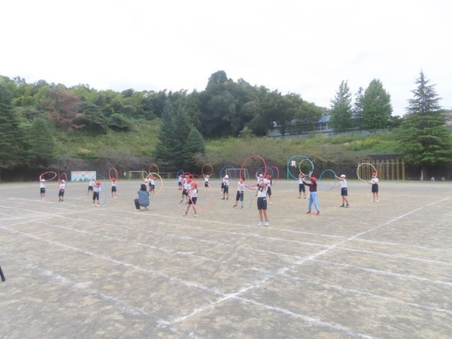 1・2年生が「とおりぬけフープ!!」の練習をしました。フラフープをくぐったり、跳んだり、回したり、・・・。いろいろなことに挑戦していました。だいぶうまくできるようになりました。