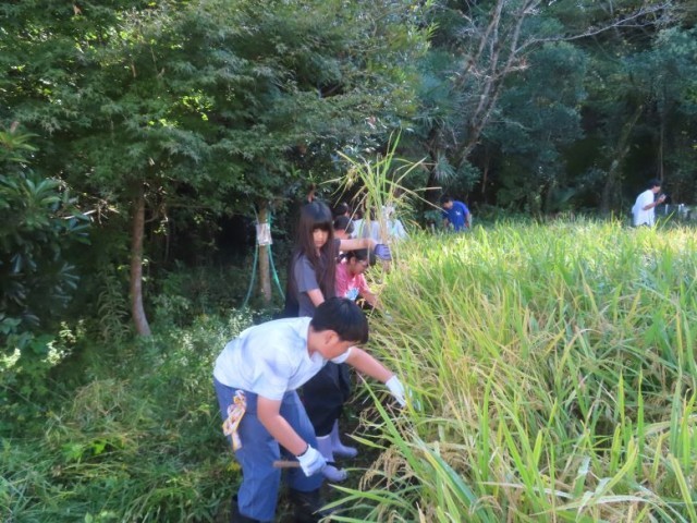 今日は朝からよい天気になりました。5年生の稲刈りは予定通り行うことができました。