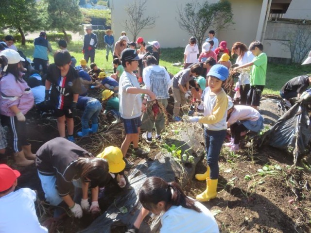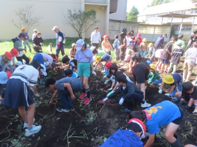 給食後、全校で芋ほりを行いました。ロング昼休みの時間に、芋ほりをしてから、土落とし、おもしろいもの決定、重さの測定、たてわり班ごとに記念撮影など、頑張ってやりました。
