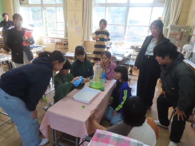 自分だけで考えた後、友達と一緒に考える時間を設けていました。自分の考えを友達に理解してもらおうと、線分図を指しながら一生懸命説明している子どもたちの姿が印象に残りました。最後に、自分たちが求めた量で、緑色の絵の具を作ってみました。素晴らしい6年生です。