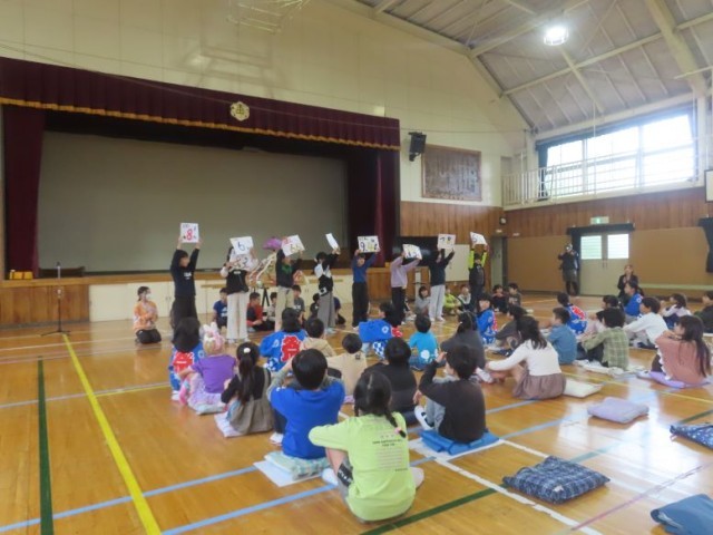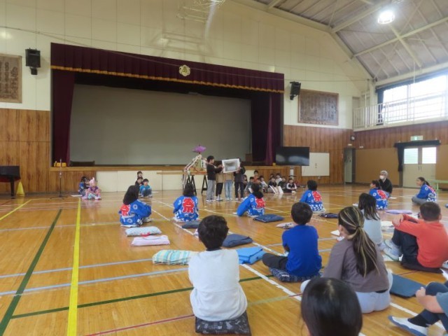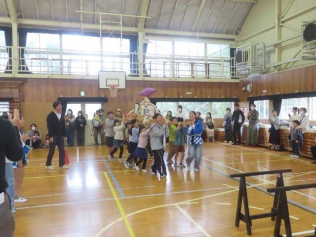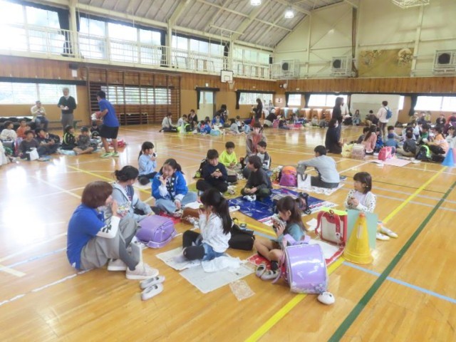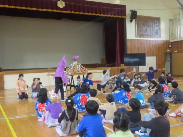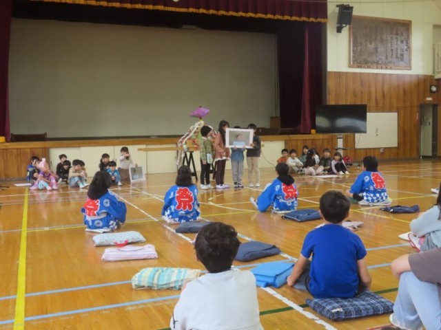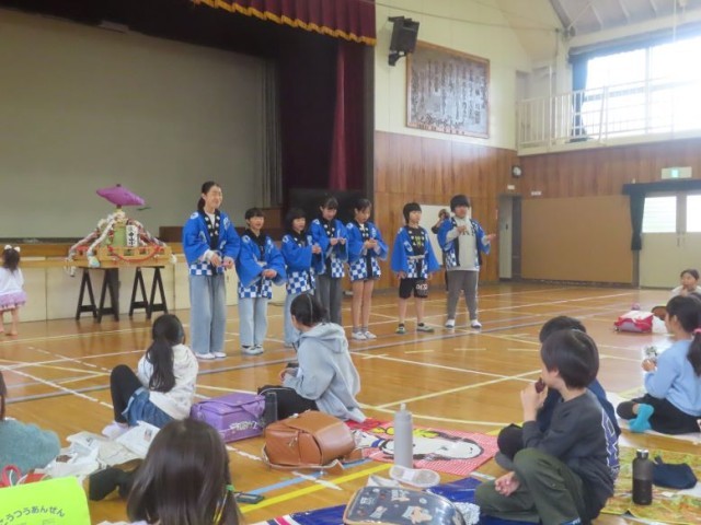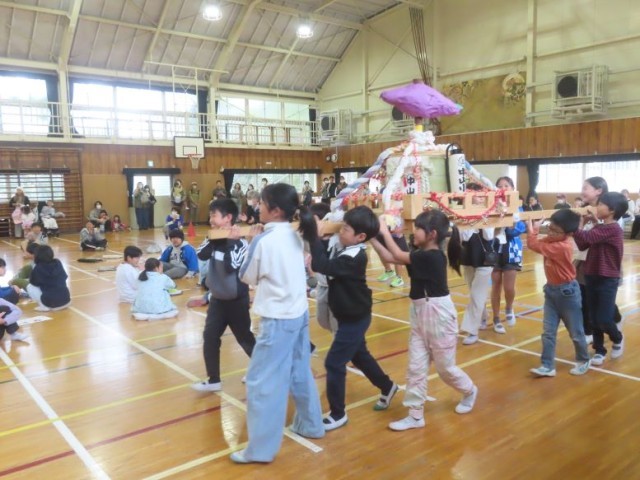2校時、体育館ではじめの会を行いました。校長先生の話の後、3・4年生の収穫高の発表、1・2年生のおもしろいもの発表、たてわり班ごとのお神輿リレーをしました。「ワッショイ!ワッショイ !」元気な声が体育館いっぱいに響きました。