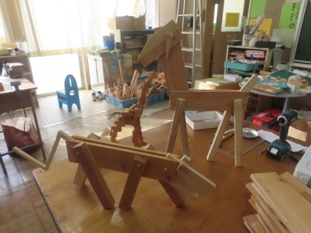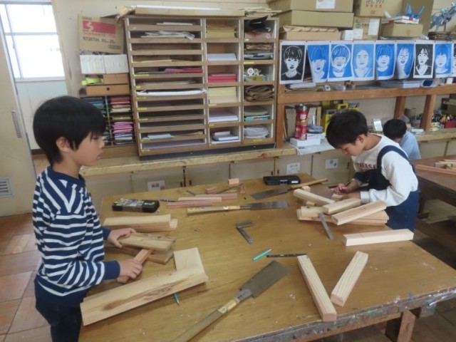 3年生が図画工作で「フブキと森の仲間たち」に取り組んでいます。角材や抜き板を使って、思い出のフブキとその仲間の動物たちを制作します。子どもたちのフブキへの思いがこもった作品になります。