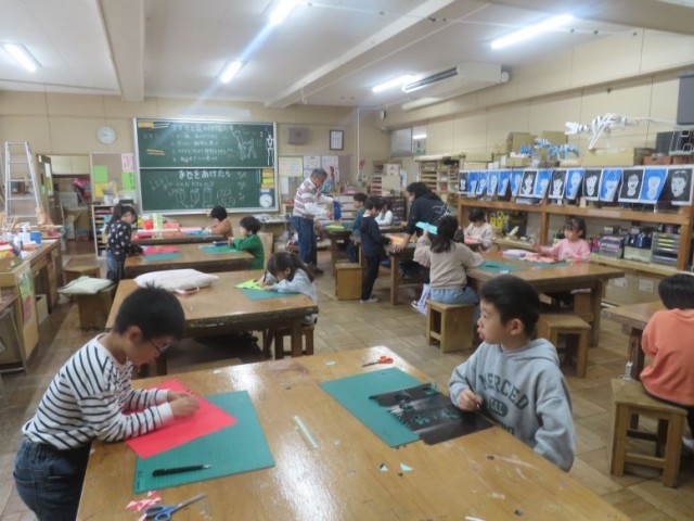 2年生が図画工作の学習で紙工作「窓をあけたら」に取り組んでいます。カッターナイフを使って、窓のある建物を制作します。カッターナイフの扱い方、安全指導をしっかりと行っています。