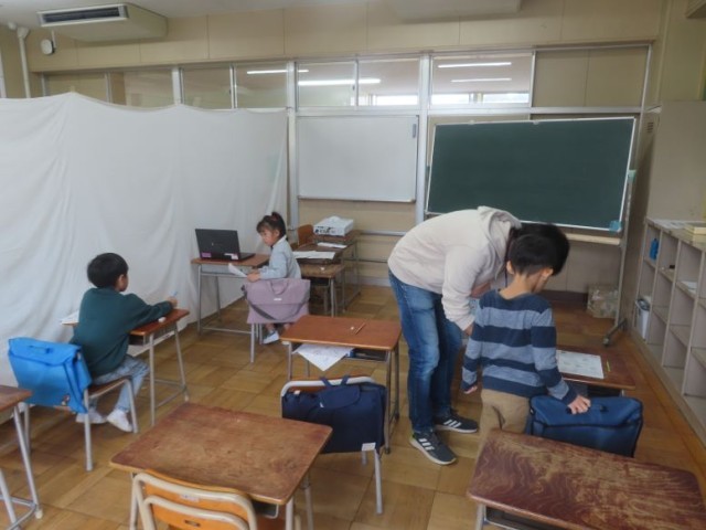 1年生が算数で「かたちづくり」の学習をしています。色板を回したり、ずらしたり、裏返したりして、形づくりをしています。友達が作った形を見て、学び合いもしています。十分に色板の操作をして理解が深まったら、プリントを使った学習もします。