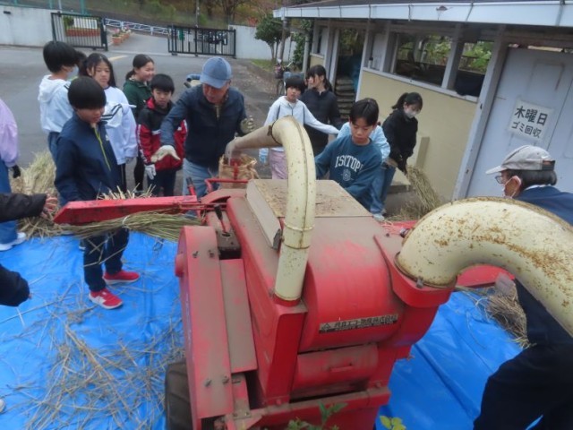 5年生が育てた稲の脱穀ともみすりをしました。今回も、地域の方に教えていただきました。