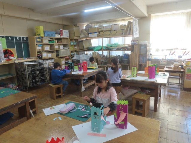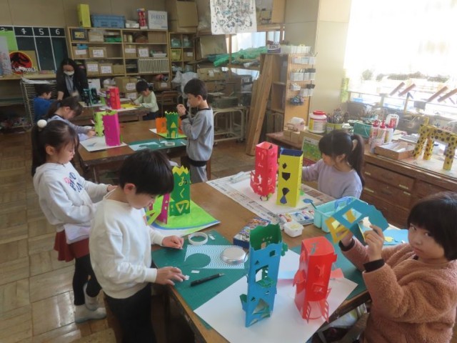 2年生が図画工作の学習で、色画用紙をカッターで切り出し、窓のある建物を作っています。窓の形を工夫したり、切り取った紙を活用して飾りをつけたりしています。