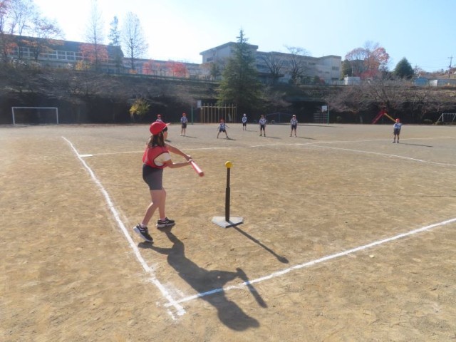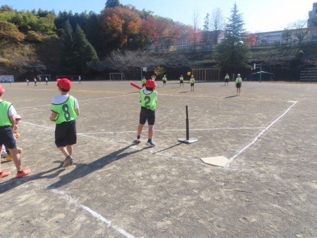 3・4年生が体育でベースボール型のゲームのティーボールをしました。今日は、バッティングティーに置いたボールを打つ練習をしました。野球が得意な子どもが、バットの持ち方や振り方などをやさしく教えていました。
