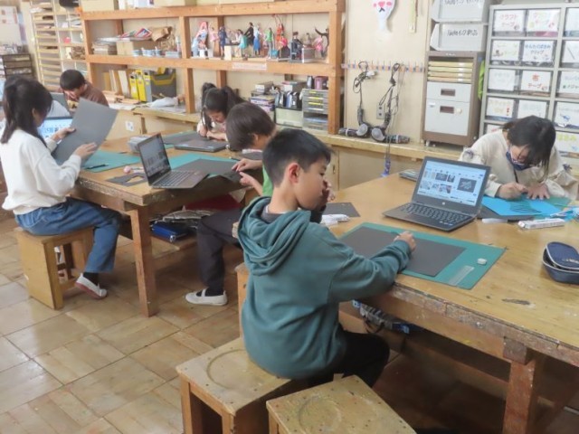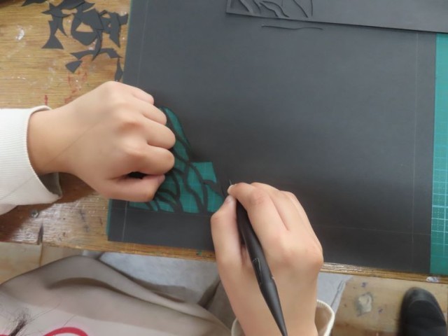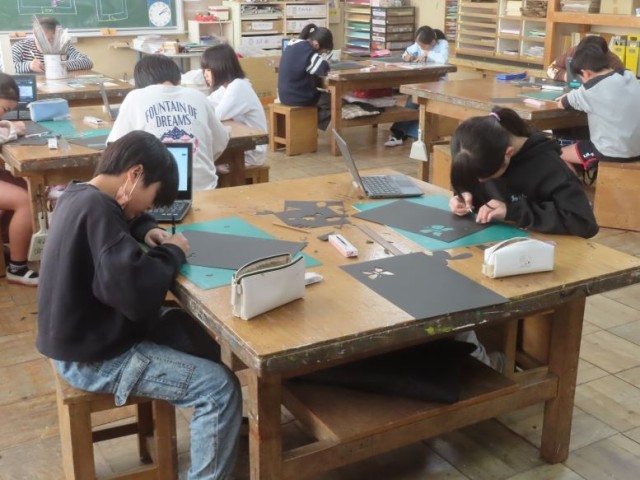 5年生が図画工作の学習で、デザインナイフを使って色画用紙を切り抜き、ランプシェードを作っています。細かな作業なので、集中しなければできません。