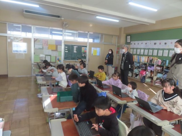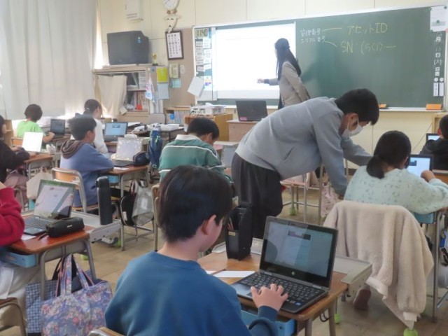 児童向けのアンケート調査もクロムブックを使って行うことが多いです。操作の仕方が分からないときは、担任の先生やICT支援員さんから教わります。写真は、2年生と5年生がアンケートに回答しているところです。