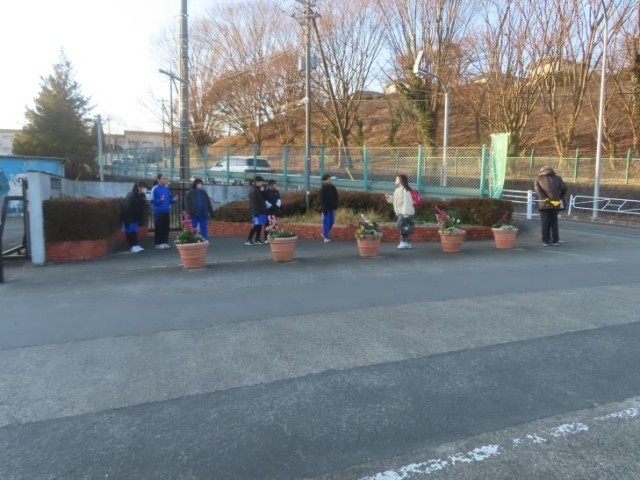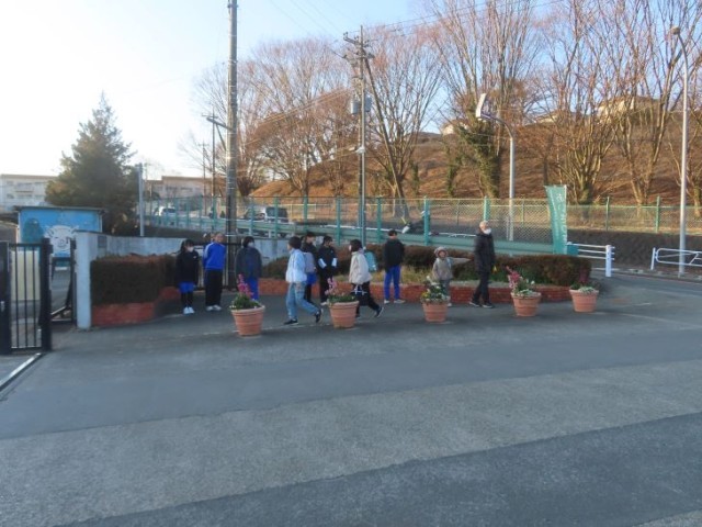 あいさつ運動2日目、中山中学校の生徒が中山小学校の正門に立ち、「おはようございます。」とあいさつしてくれました。明日、中山小学校の児童が中山中学校の正門に立つ予定です。