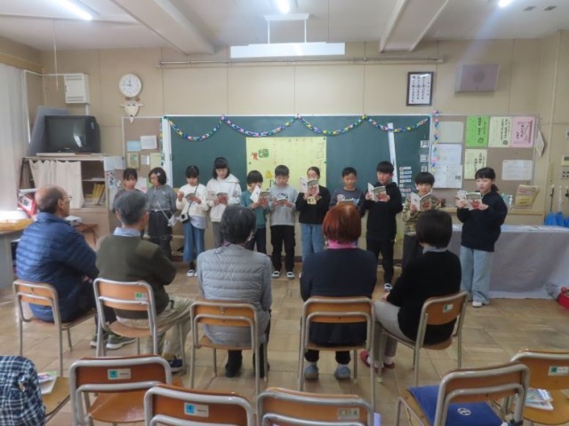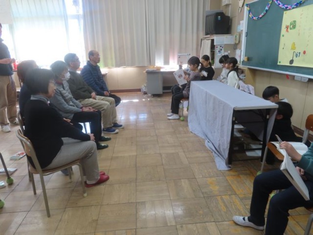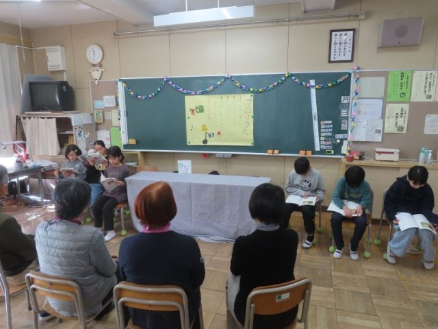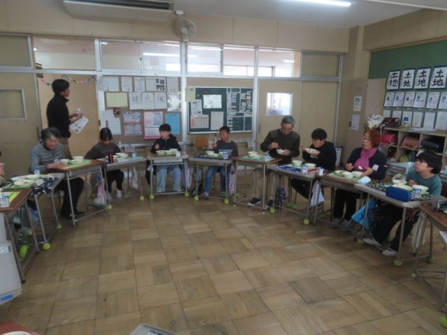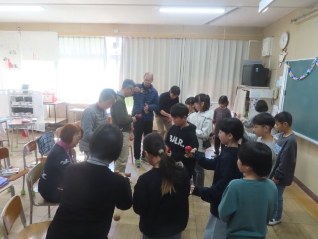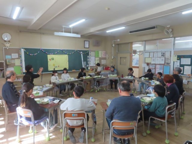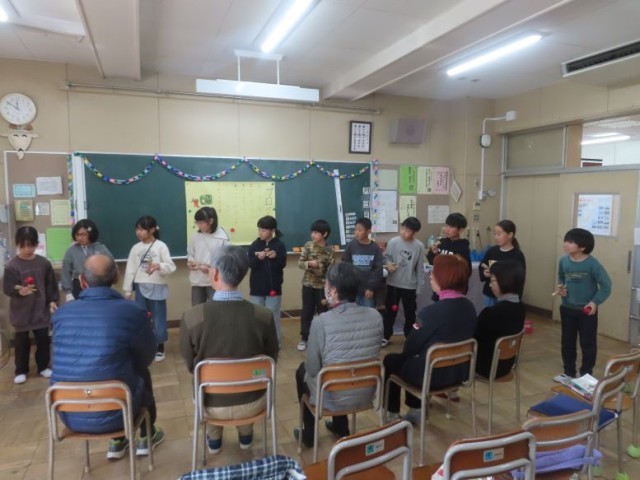 4年生が普段お世話になっている方々に感謝の気持ちを伝えるため、ふれあい給食を行いました。4時間目に、人形劇「ごんぎつね」、歌「涙そうそう」、ふれあい遊び「けん玉」をしました。その後、給食の時間になりました。