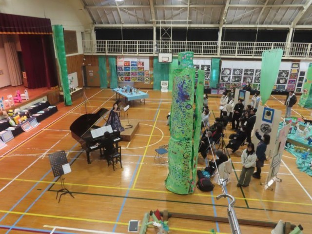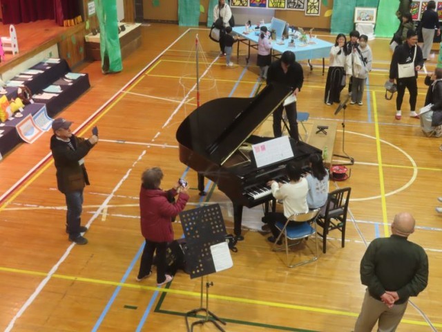 午後には、作品展の会場である体育館で音楽会が行われました。始まる前から満席の状態で立ち見の方もたくさんいました。この音楽会には音楽クラブのほか、本校の卒業生、本校の先生、八王子市内の音楽の先生が出演してくださいました。途中、演奏と演奏の間に時間ができたとき、ピアノの演奏をしてくださる方もいました。作品展を盛り立ててくださり、ありがとうございました。
