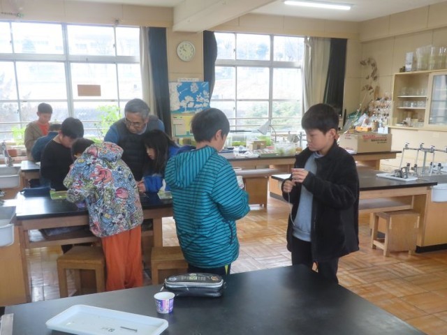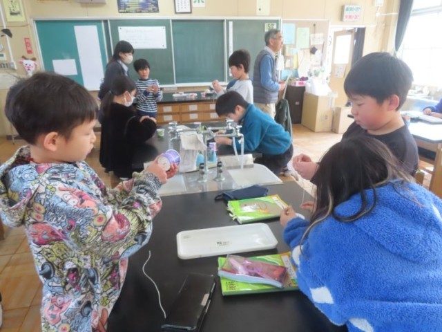 3年生が理科で「音のせいしつ」の学習をしています。今日は、ある動物の鳴き声が聞こえる道具をつくりました。ヨーグルトなどの容器の底に穴をあけ、糸を通して引っ張っても糸がとれないようにクリップにつなぎます。糸をぴんと張って、糸をこすると・・・。確かにある動物の鳴き声のように聞こえました。