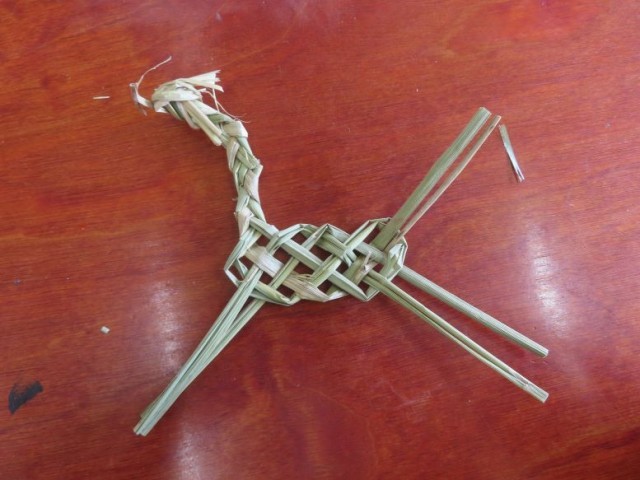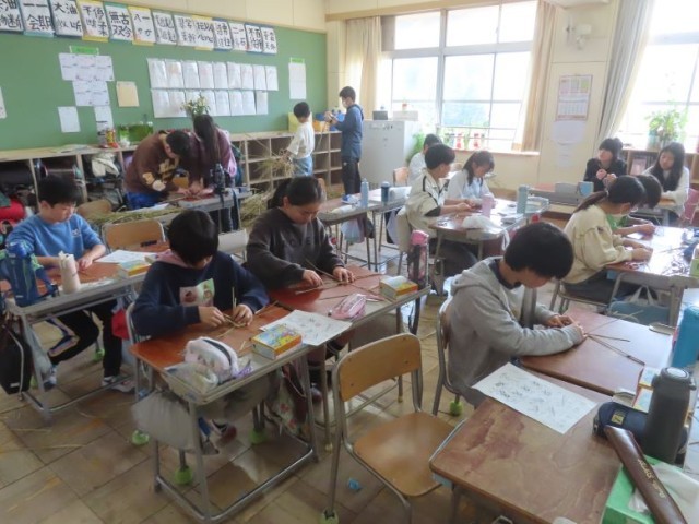 5年生が、3月28日(土)に中山中学校で行われるさくら祭りで販売するわら細工をつくりました。今日つくったのは、馬です。4本の藁で作りました。なかなかうまくできませんでしたが、やり方が分かれば、大丈夫。よい作品になりそうです。
