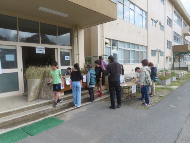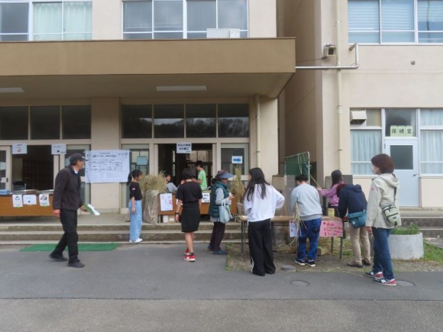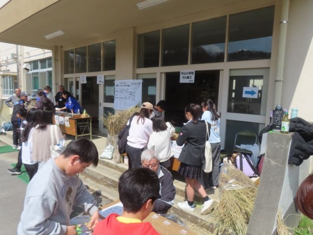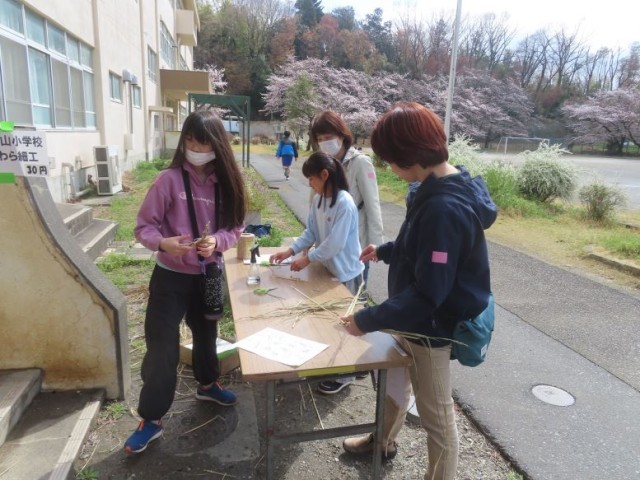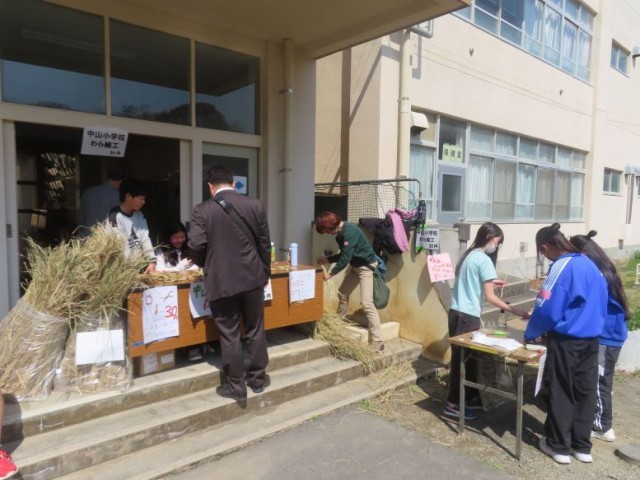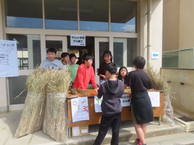 3月28日(土)、5年生の希望者が、中山中学校で行うさくら祭りでわら細工の販売体験をしました。当日、6年生1名も飛び入りで販売体験に参加してくれました。自分たちが育てたわらで作ったしめ縄、馬、ほうきなどを1つ30円で販売しました。「いらっしゃいませ。」「ありがとうございます。」など、お客さんとのやり取りも自然にできました。無料の体験コーナーも人気で、馬を作った方がたくさんいました。子どもたちは貴重な体験ができました。ありがとうございました。