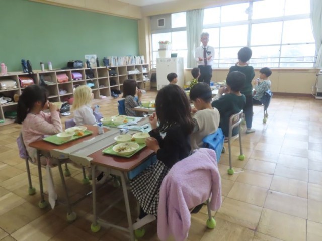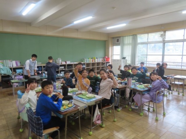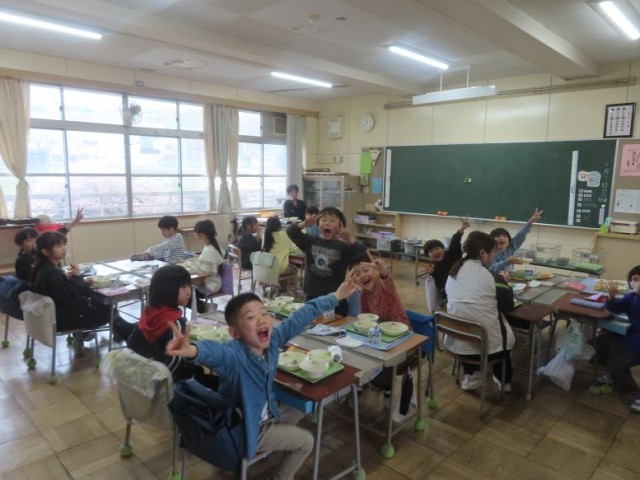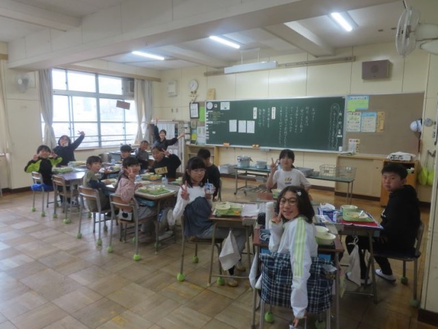 2年生以上は、今日から給食が始まりました。給食を食べているところを訪問し、1枚パチリ。写真は上から順に、6年生・5年生・4年生・3年生・2年生です。2年生は、先生が大切な話をしているところでしたので、静かに撮影しました。全員が写ってなくてごめんなさい。