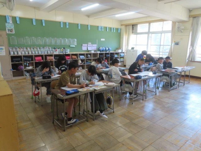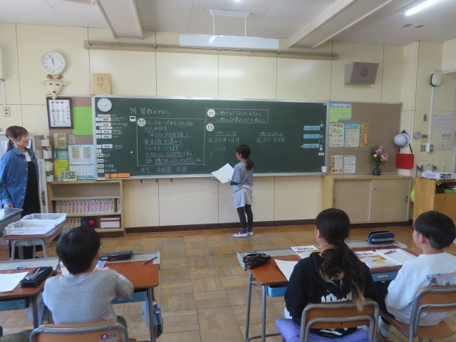 5年生が算数のとびらの学習として、小数のたし算、ひき算の仕方を考える学習をしました。一人で考える時間「おひとり様タイム」でじっくりと考えてから、友達の考えを見せてもらうこともできる「スパイタイム」、自分が考えたことを隣の子どもに説明する「お二人様タイム」(2枚目の写真)と続きました。それから、全体で友達の考え方を全体で共有していました。(3枚目の写真)