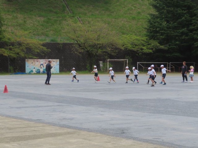校庭の改修工事が終わり、今日から使うことができます。早速、1年生と2年生が校庭で体育の学習をしました。平らで走りやすい校庭になりました。