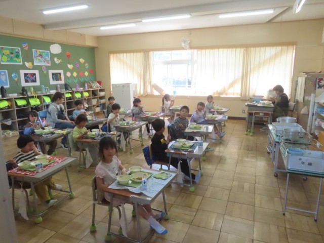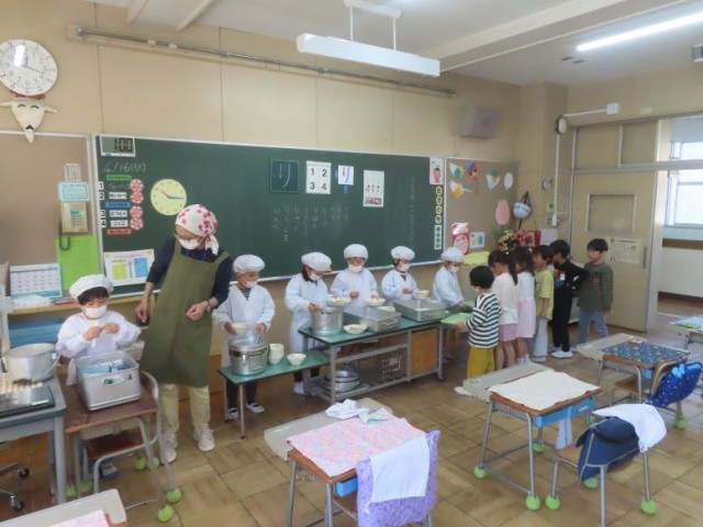 1年生の給食は、早いもので4日目になりました。準備の仕方もしっかりと覚えたようです。給食当番の仕事も頑張っていました。
