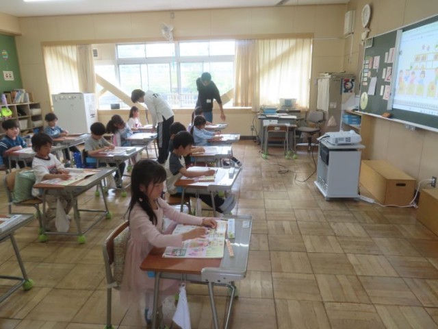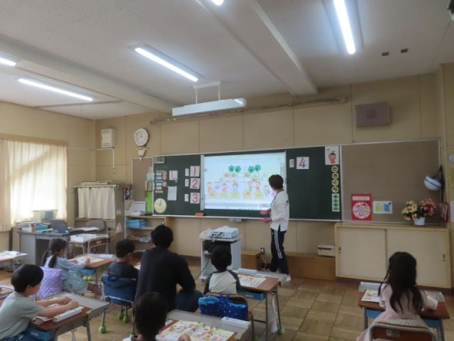 1年生が算数で「かずとすうじ」の学習をしています。具体物と半具体物を対応させながら、数に表していました。
