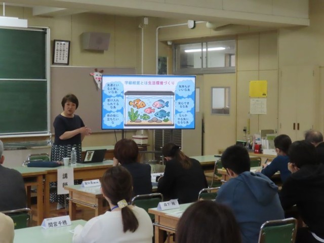 4月27日(月)、校内研究全体会がありました。今年度は特別活動の研究をします。講師は、学校法人八王子学園なかよし幼稚園園長 清水 弘美先生にお願いし、「教師の仕事を10倍楽しくする〜特別活動の基礎基本〜」について教えていただきました。