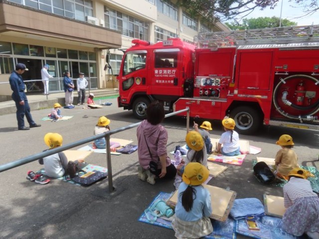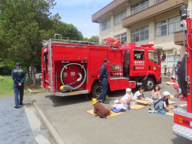 はたらく消防の写生会のため、2台の消防車が中山小学校に来ました。いつもは校庭の中まで消防車が入るのですが、昨日までの雨で校庭が柔らかいので、昇降口近くのアスファルトの上に駐車してもらいました。子どもたちは興味深そうに絵を描いていました。