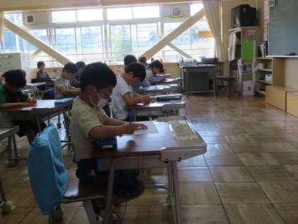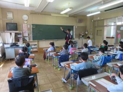 1年生が鉛筆の持ち方の学習をしました。2本の鉛筆を箸のように持ち、下にある1本を抜くと、鉛筆の正しい持ち方になることを教えてもらいました。正しい持ち方ができたら、いろいろな線を引く学習にうつりました。