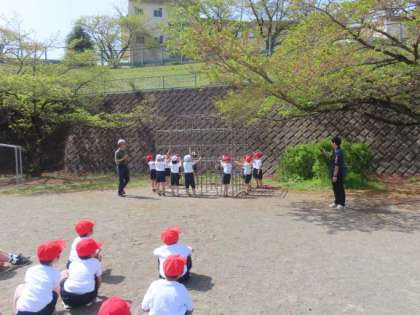 体育は2学年合同で学習します。1・2年生が体育でジャングルジムをのぼりおりする運動遊びをしました。自分がのぼることができる高さまで行き、タッチしておりてくることを楽しんでいました。