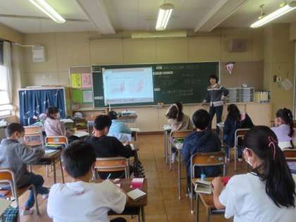 5年生が算数で「体積」の学習をしています。今日は、直方体や立方体の体積を計算で求める方法を考えました。1段目の体積を縦×横で求め、それが何段分あるのかと考えれば求められることを理解しました。