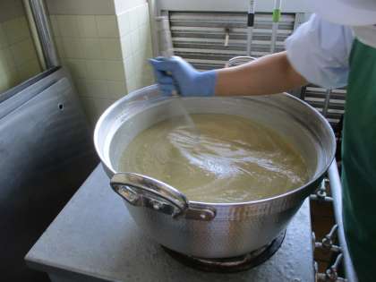 給食では、カレールーを手作りしています。油とバターで小麦粉を茶色になるまでじっくり炒め、カレー粉を加えて作っています。今日は、2時間かけてルーをつくりました。また、玉ねぎも、あめ色になるまで炒め、甘みを引き出します。給食ならではのカレーです。