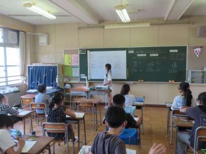 5年生が小数のかけ算の学習をしています。今日は筆算のしかたを考えました。小数点をどこに打つのか。理由をしっかりと説明していました。
