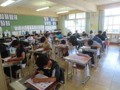 6年生が外国語に時間にテストを受けました。スピーカーから流れる音声を聞きながら、問題に答えていました。