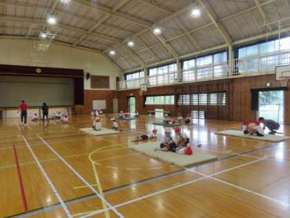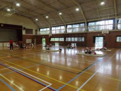 1・2年生が体育館で体力テストで上体おこしをしました。低学年の児童には、やり方から説明する必要があります。練習をしてから記録をとりました。