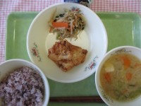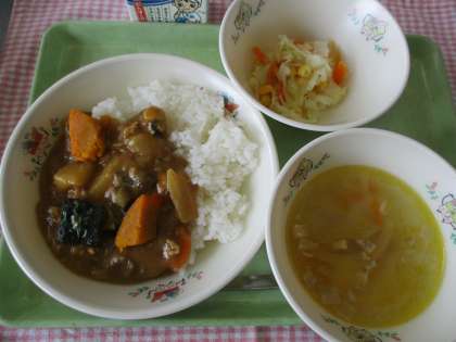 今日のカレーには八王子産の玉ねぎ、夏野菜のかぼちゃ、なすが入っています。夏野菜には、汗で失われがちなビタミンやミネラルがたくさん含まれています。季節の旬を食べると、その時期に欲しい栄養素が得られます。旬を生かした食生活をしましょう。
