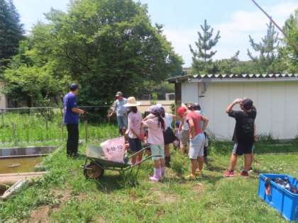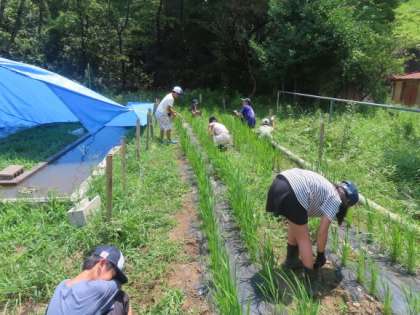 5年生が栽培している陸稲もだいぶ伸びてきました。今日は、熱中症対策をした上で雑草を抜く作業と追肥を行いました。