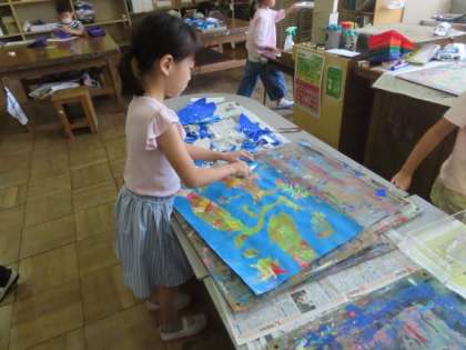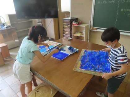 2年生 ギョエーイ!? 公開日 2023/07/20 更新日 2023/07/20 2年生 2年生が図画工作で「ギョエーイ!?」の学習をしました。画用紙で作った型を台紙にのせ、その上から色付きローラーを転がして素敵な海の様子を表しました。 いいね(0)
